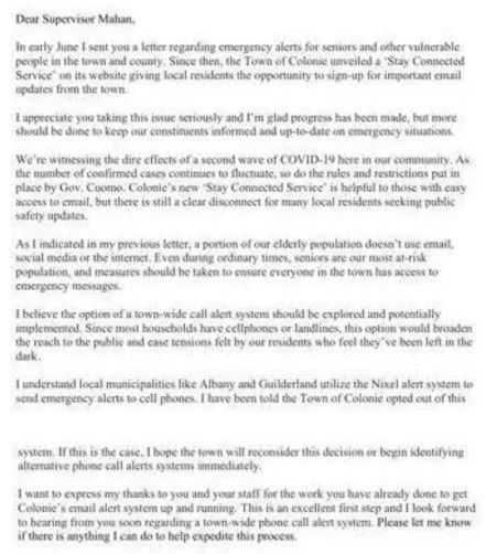 "During the Covid outbreak of 2020, I sent a letter to Supervisor Mahan about the crucial need for emergency alerts for seniors and other vulnerable people in the town of Colonie. I’m happy that Supervisor Mahan has taken my proposal seriously and implemented the new 'Stay Connected Service' on the Town of Colonie website, giving local residents the opportunity to sign up for important email updates and alerts from the town. This is an important first step, but we have more work to do. The email alert system is helpful to those with easy access to email, but there is still a clear disconnect for many other residents seeking public safety updates that don’t use email or have internet access."